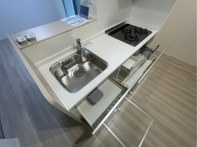 エルフォルク新神戸のキッチンは、システムキッチン+カウンター式で設計されており、料理や家事を快適にこなせる作りになっています。システムキッチンは調理スペースや収納が整っていて、ガスコンロ(3口程度対応)やグリル付きのコンロが設置可能な仕様で、自炊のレパートリーが広がりやすいです。カウンターキッチンはリビング・ダイニングと視線がつながるため、家族や来客とのコミュニケーションを取りながら調理でき、作業中も孤立しにくい動線が魅力です。対面にすることで配膳や後片付けの動作もスムーズになります。システムキッチンは収納や調理スペースが確保されているので、調理器具や食材の整理整頓がしやすく、日々の料理が効率的に進みます。また、都市ガス対応のため火力が安定しやすく、和食・洋食問わず本格的な料理にも対応しやすいのが特徴です。キッチン周りの照明や換気も整っているため、匂い・煙への配慮も十分です。全体として、エルフォルク新神戸のキッチンは、使い勝手のよい設備と動線の良さから、単身・カップル問わず日々の料理や家事を快適に行える仕様となっています。