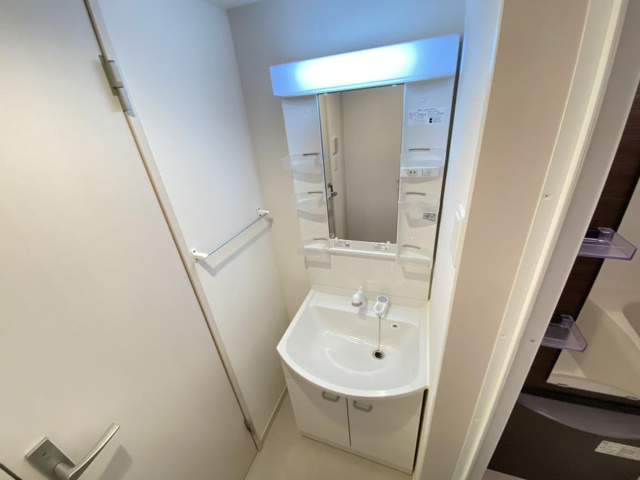 リブリ・シーサイドコート芦屋の洗面所(洗面化粧台)は、単身の暮らしでも快適に使える独立したスペースとして設計されています。洗面所は独立タイプで、バスルームやトイレと切り離された空間に配置されているため、朝の身支度や帰宅後のケアを効率よく行えます。独立した洗面化粧台には鏡が付いており、顔を洗う・歯磨きをするといった基本の動作はもちろん、ヘアスタイルのセットやスキンケアにも便利です。鏡上部や下部には収納スペースがあり、歯ブラシ・化粧品・タオルなどの日用品を整理整頓しやすいのも魅力です。室内設備として洗面所独立・洗髪洗面化粧台が備え付けられており、水回りの使い勝手がよく考えられています。特に忙しい朝やお風呂上がりの身支度がスムーズに行えるのがポイントです。また、洗面所と浴室の間に脱衣スペースが設けられているため、プライバシー性が高く、急な来客時でも他の生活空間と区別して使える設計になっています。清潔感のある空間に加え、収納力と実用性を両立した洗面所は、単身者のライフスタイルを快適にサポートします。こうした水回り設備の充実は、日々の生活をより快適にする大きなメリットです。