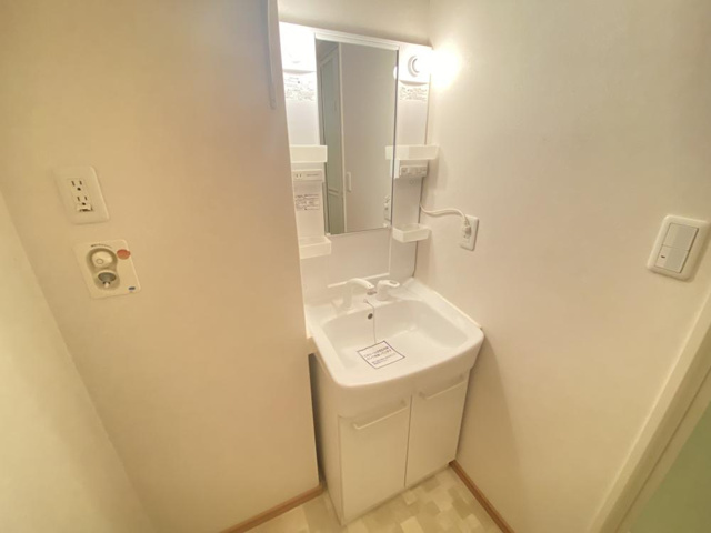 「グレース芦屋」は、独立した洗面所(洗面台・脱衣スペース)付きが大きな魅力です。1LDKの102号室などの募集住戸では、バス・トイレ別設計にくわえ、独立した洗面台(シャンプードレッサー)を備えている点が特徴的です。これにより、入浴時に脱衣と洗面の動線が分かれ、家族やパートナーと同じ時間帯に支度をしても快適に使える設計になっています。洗面スペースは、洗面ボウル・鏡・収納棚が一体となったシャンプードレッサー形式で、朝の身支度や夜のスキンケアなどの日常的な作業がしやすい造りです。鏡裏や下部の収納には、歯ブラシ・化粧品・洗面用具が整理しやすく、タオル類や衛生用品の収納にも便利です。また、脱衣所空間が確保されているため、洗濯機置き場との動線もスムーズで、入浴前後の着替えやランドリー作業が効率的に行えます。洗面所は清潔感のある仕上げで、明るい室内照明の下でも使いやすい設計。バス・トイレと独立しているため、湿気のこもりにくさや掃除のしやすさといった実用面でも優れています。日々の生活の中での利便性と快適性を両立した水回り設備として、単身者やカップルの新生活にも適したポイントです。