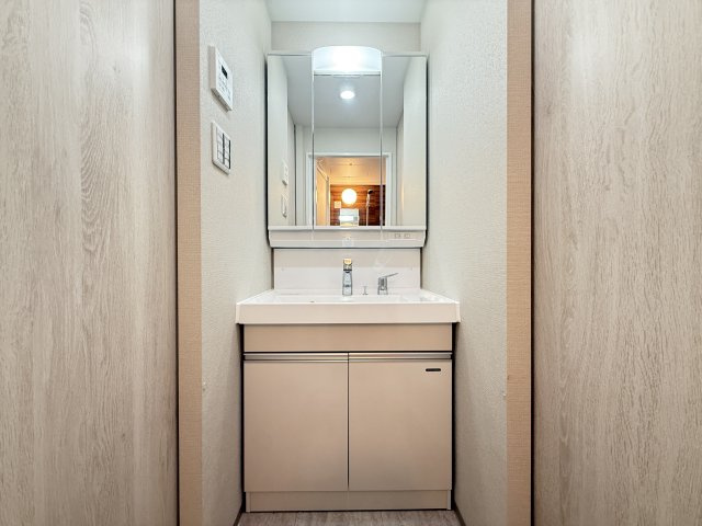 この物件の洗面台は、脱衣所と独立した洗面所に設置された洗面化粧台が標準設備です。独立型の洗面台なので、バスルームやトイレとスペースが分かれており、朝の身支度や夜のリラックスタイムでも周囲を気にせずゆったり使える設計になっています。洗面化粧台には広めの洗面ボウルとミラー(鏡)、照明、収納棚が備わっており、洗顔・歯磨き・ヘアセットが快適に行えます。また、鏡の周囲には照明が配置されているため、顔まわりが明るく見え、メイクや身だしなみチェックにも便利です。蛇口はシャワーヘッド付きタイプで、髪を洗ったり、洗面ボウル内で軽く洗濯物をすすぐといった使い方にも対応しやすい仕様です。洗面化粧台下やミラー裏の収納スペースには、歯ブラシや化粧品、タオルなどの日用品を整理整頓でき、すっきりとした洗面スペースを保ちやすいのもポイントです。さらに、脱衣所との動線がスムーズなため、入浴前後の準備がしやすく、家事や身支度の効率を高める設計になっています。温水洗浄便座や浴室乾燥機など、水まわりの設備も充実しており、日常生活の快適性を高める一助となっています。全体として、ネクストステージ神戸元町の洗面台は、独立性・収納性・使い勝手の良さを両立した水まわり設備で、単身者やカップルの新生活にもおすすめできる仕様です。