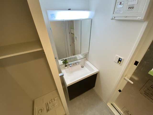 Saien西宮の洗面所は、独立した洗面脱衣スペースとして暮らしの利便性を高める設計になっています。洗面所内には、単なる洗面台だけでなく、洗面化粧台がしっかり設置されており、鏡や収納スペースが備わっているため、日々の身支度やスキンケア用品の整理がしやすいのが特徴です。鏡まわりの収納は、化粧品や歯ブラシ、タオルなどをすっきりと収納でき、洗面まわりを常に清潔に保つ工夫がされています。洗面所には室内洗濯機置き場もあり、洗濯と入浴の動線が効率的にまとめられているため、家事の負担を軽減します。脱衣スペースとしての余裕もあるため、着替えやタオルの置き場所にも困らず、朝の身支度や帰宅後のケアがスムーズに行えます。空間は白を基調とした明るい内装でまとめられており、清潔感がありながらも日常の使い勝手を重視した仕様です。こうした独立洗面所の設計により、Saien西宮の洗面エリアは機能性と快適性を両立した生活空間として評価できます。洗面所とバスルーム、トイレが別々に配置されていることで、家族や同居者との時間帯が重なってもストレスなく使える点も魅力です。