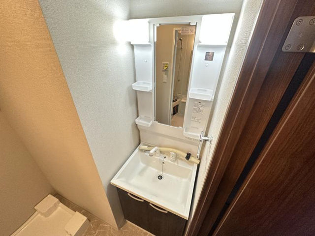 毎日使う場所だからこそ、使いやすさと清潔感にこだわった洗面空間。ファーストフィオーレ尼崎ウエストでは、身支度を快適に行える独立洗面台を採用しています。大きめのミラーは身だしなみチェックがしやすく、朝の準備もスムーズ。鏡裏や洗面ボウル下には収納スペースを確保しており、化粧品や洗面用品、ストック類までしっかり整理整頓できます。生活感を抑えたすっきりとした空間を保てるのも魅力です。洗面ボウルは使いやすい広さで、水はねしにくい設計。シャワー水栓付きタイプなら、洗髪やお掃除にも便利です。室内洗濯機置場も同空間に配置されているため、家事動線も良好。洗濯から身支度までを効率よくこなせます。清潔感あふれるデザインと機能性を兼ね備えた、快適な洗面スペースです。